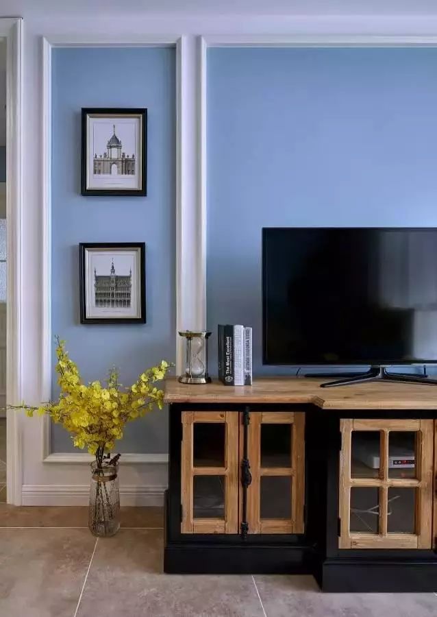 客厅整个地面铺设的都是仿古砖,墙面的颜色是浅蓝色,辅以白色的线条,再搭配上复古的家具,韵味十足。