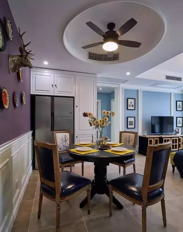 餐厅与客厅相连,白色的护墙板上面是紫色的背景墙,上面挂满了各种装饰品,很是别致。小圆桌和圆形的吊顶,在搭配上这个复古的吊扇灯,整个空间都完美和谐。