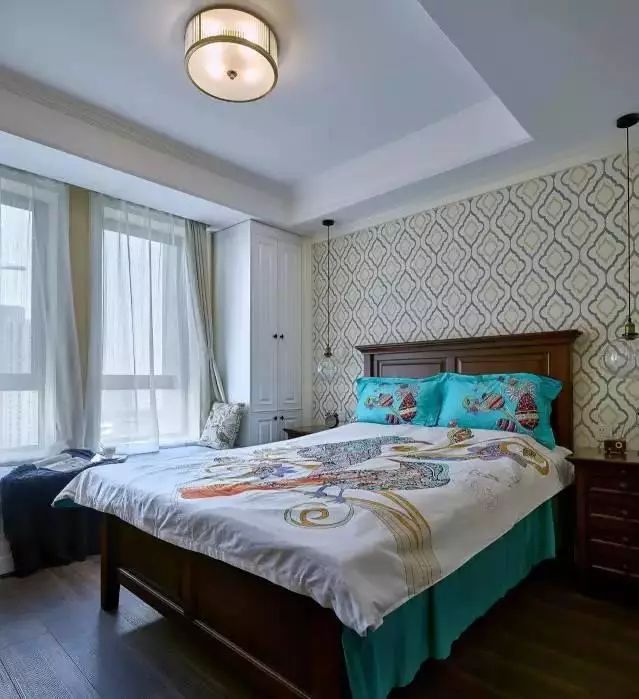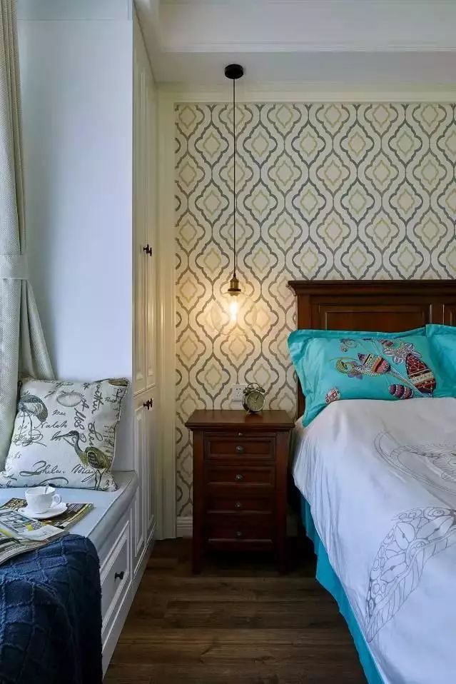 美式的床头柜,收纳能力也是很不错的。长长的玻璃吊灯,给卧室增加了一些复古的气息。