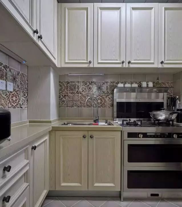 整个厨房最大的亮点在墙砖的中间部分,采用了一条素雅的花砖,把整个空间的颜值都提升了不少。再加上白色的美式橱柜和现代化的电器,让厨房更加耐看和实用。