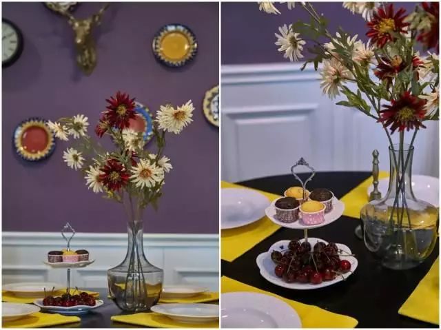 餐桌的特写。一瓶花、一些小甜点,其实就是生活中的小确幸。
