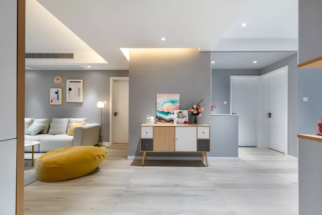 从玄关看往整个家,整体的配色就是非常有北欧风感觉的浅灰色,矮柜加上挂画、绿植的设计,给家里打造出一个端景台,看着就很美。