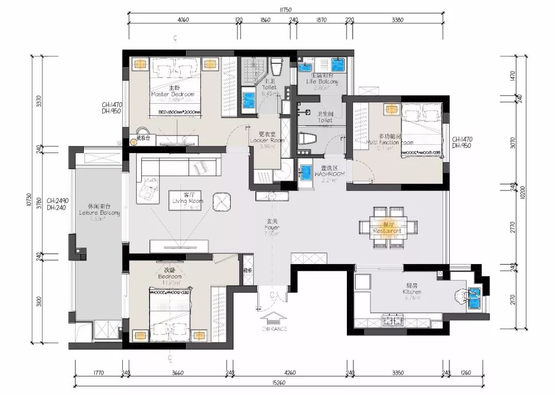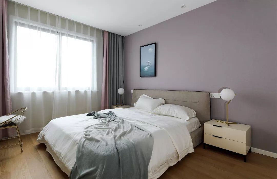 主卧室的床头背景墙被刷成了淡紫色,窗帘也加入了一些紫色,让卧室看起来更加高贵典雅一些。床尾的地方摆放一张梳妆台,方便屋主梳妆打扮。