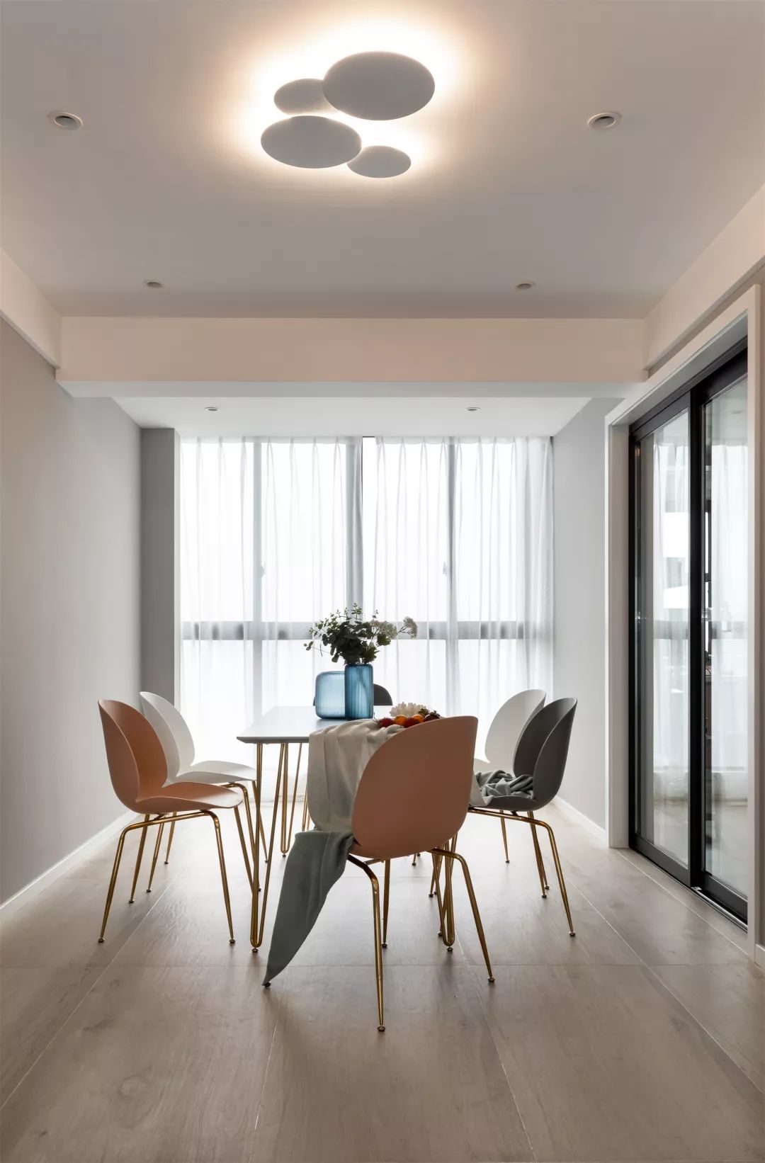 餐厅位于房子的另一侧的,餐桌椅被放在餐厅的正中,带有金属元素和大理石的餐桌椅,搭配这种马卡龙色调,看起来优雅又精致。