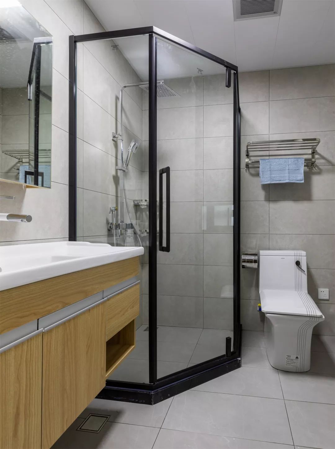 卫生间内做了干湿分离的设计,洗手台和马桶放在钻石形淋浴房的两侧,浅灰色的墙地砖搭配木色的浴室柜,看起来轻松而又舒适,和整体的风格非常搭。