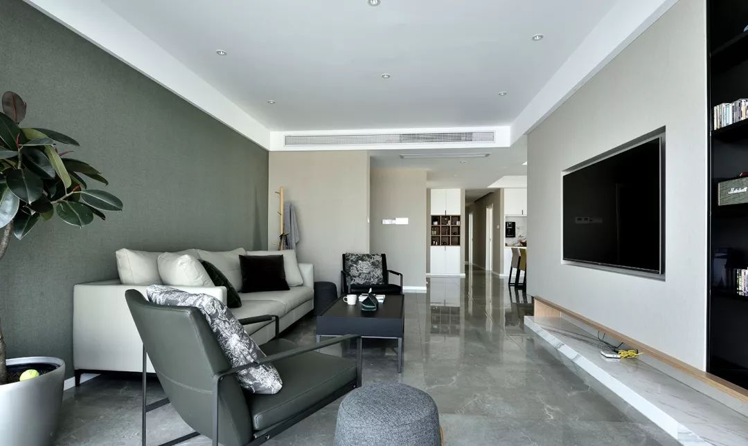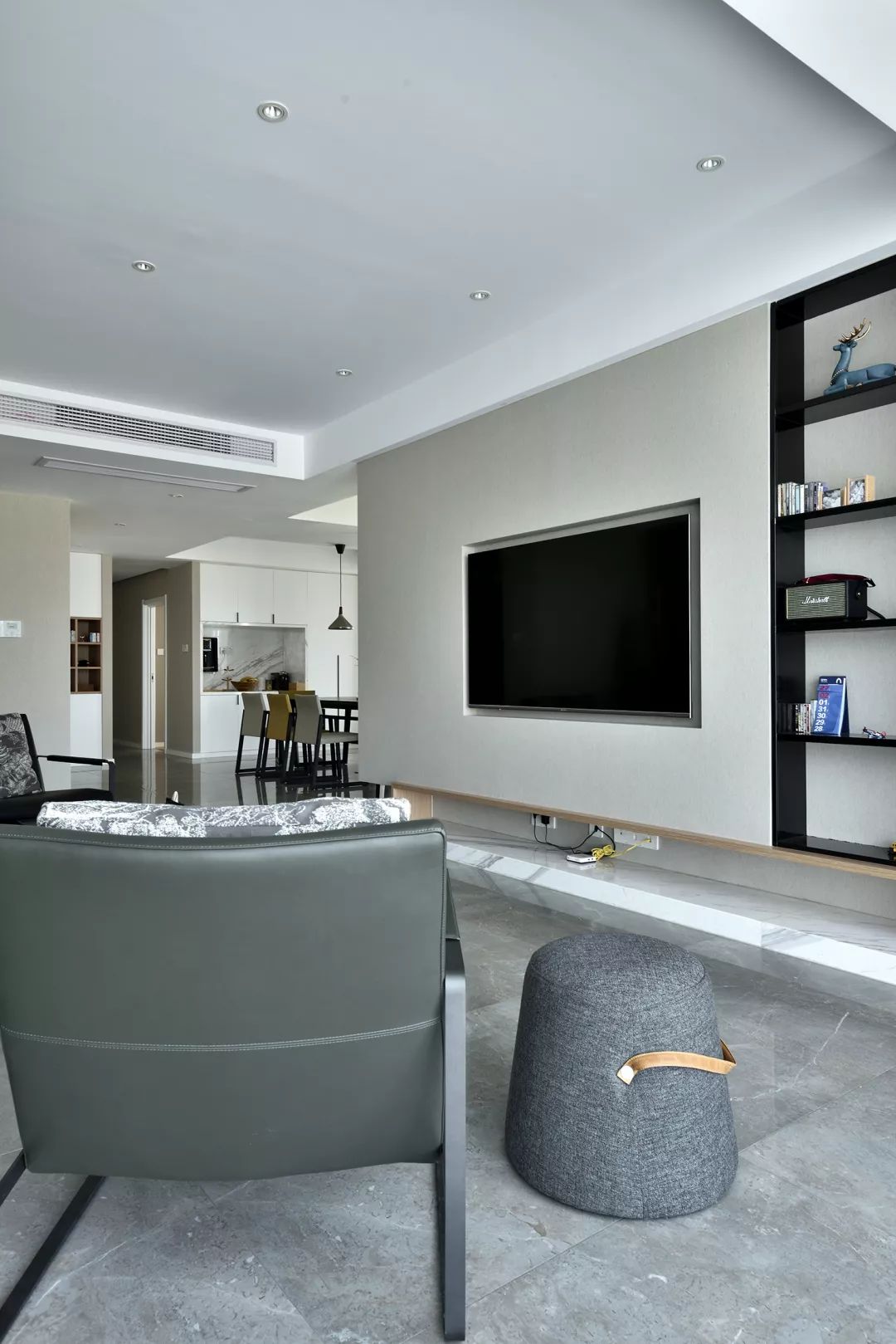 客厅的电视选择了嵌入墙内的设计,让人感觉更加简洁。底部用大理石做上一个长隔板来代替电视柜,和墙面齐平更不显突兀。