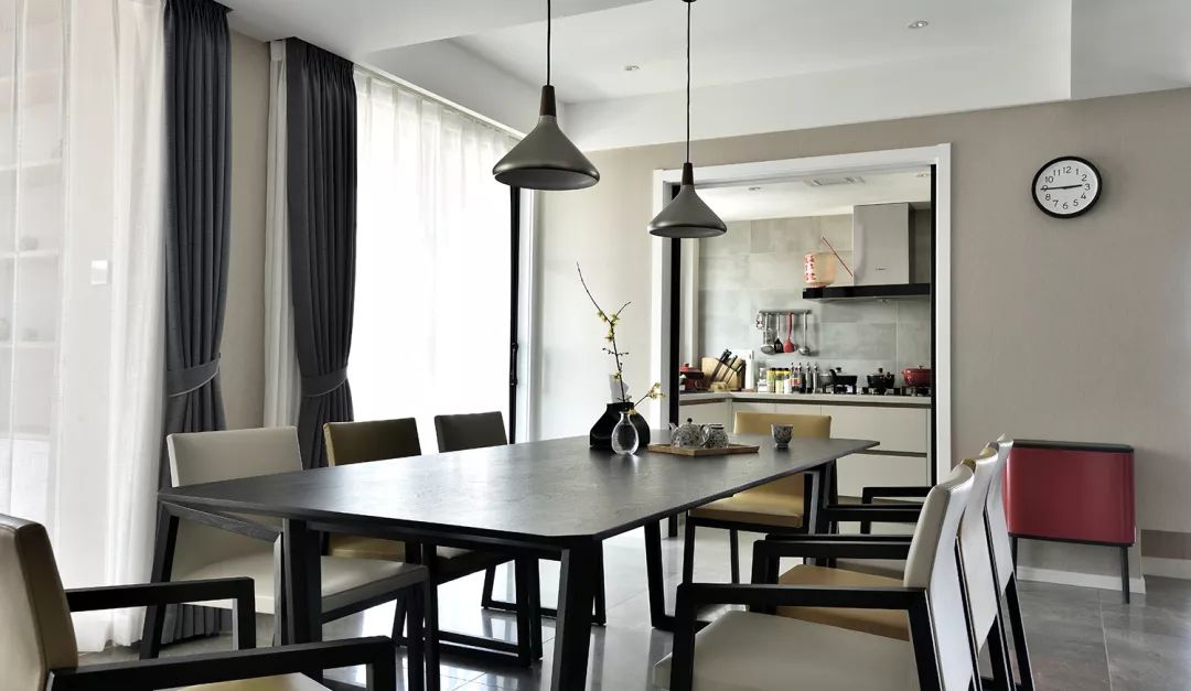 位于玄关走廊另一侧的是餐厅空间,几何线条感的餐桌椅搭配嵌入式的餐边柜和灰色调的大理石地砖,让人感觉非常的简洁大方。