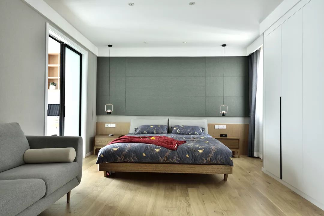 主卧室的床头背景墙做了灰绿色的硬包设计,底部加上了护墙板,让卧室变得更加层次分明。卧室床尾摆放小沙发,平时看书更舒服。