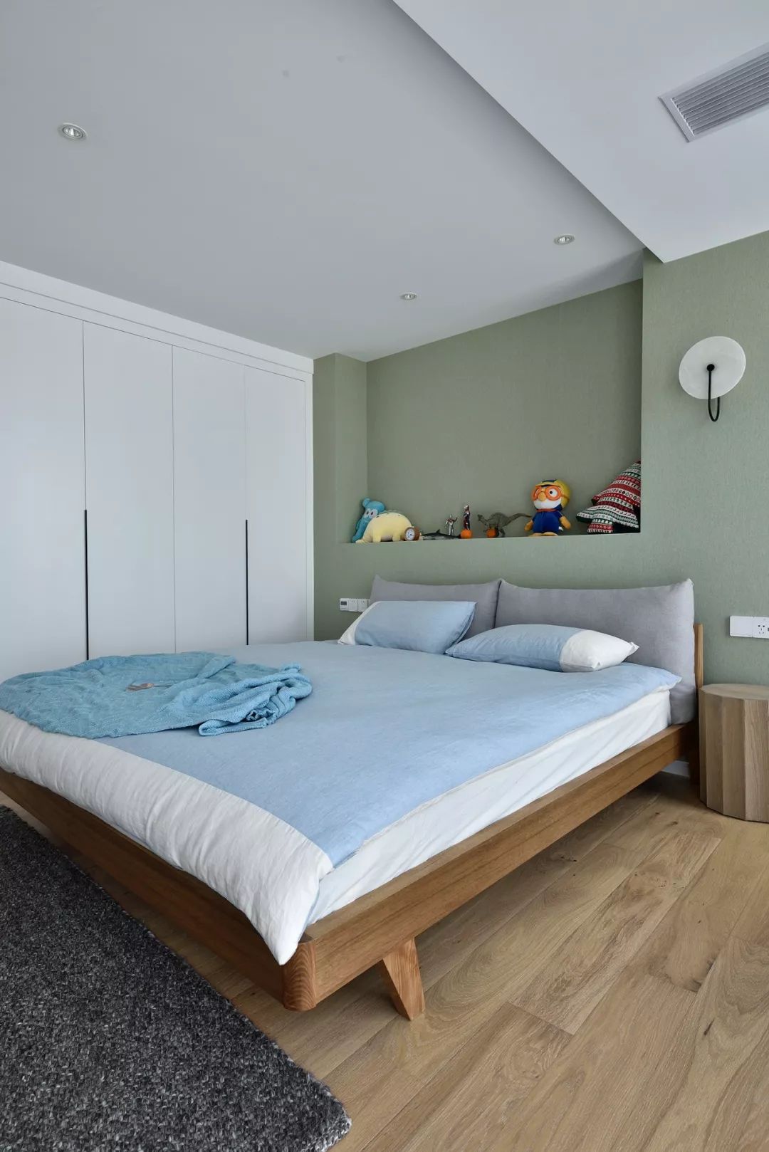 儿童房的床头背景墙刷成了绿色,搭配温馨的木质家具和地面,给人一种简约自然的感觉。背景墙上做上部分的壁龛设计,方便摆放玩偶。