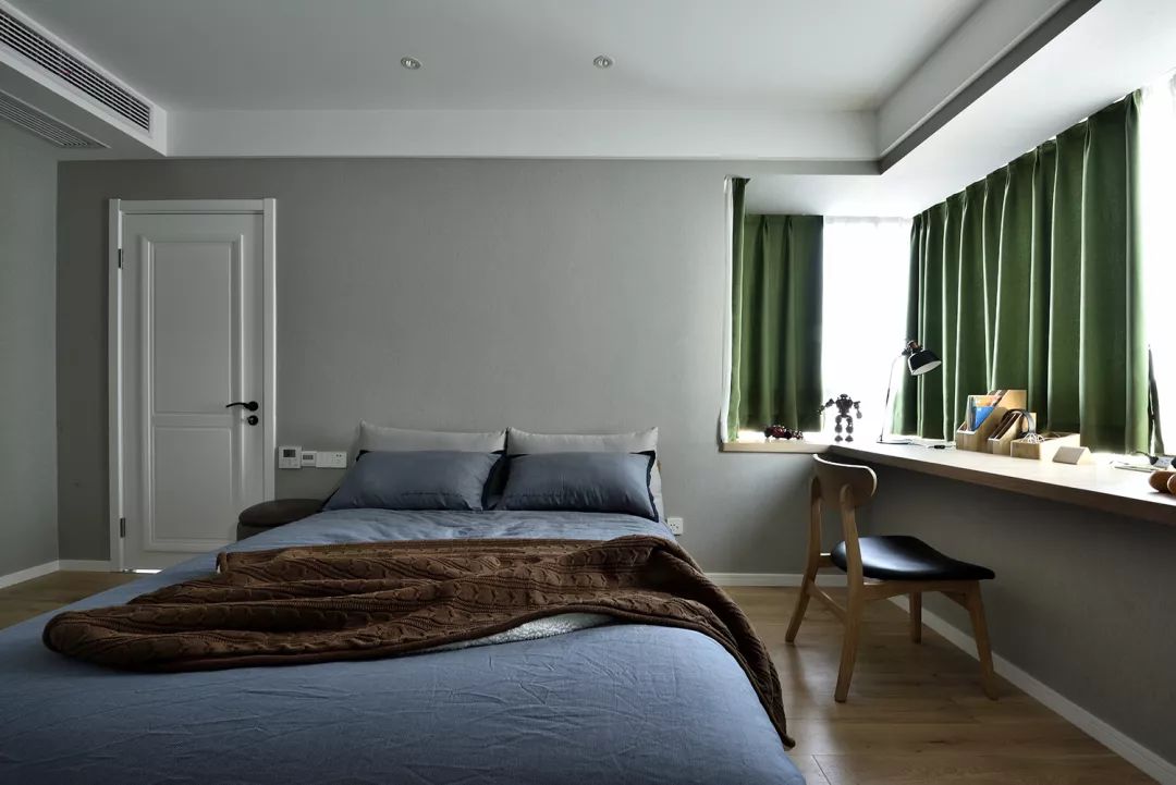 次卧选择了更为简洁的灰色作为主色调,再加上蓝色的床品和绿色的窗帘,整体配色简洁而又不单调。把飘窗作为一个长书桌,也非常实用。