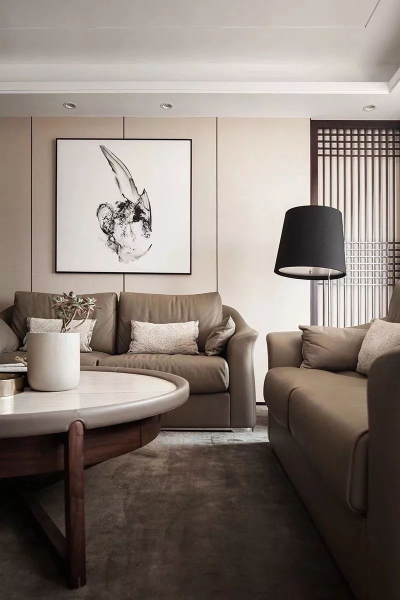 ▲沙发墙两侧做了木屏风造型,中间的泼墨挂画配合着硬包处理过的背景墙,有着独特的东方韵味;