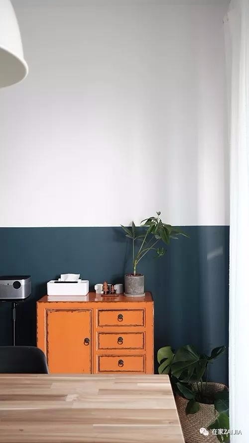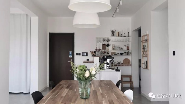 认识她 水瓶座姑娘,目前从事软装设计工作。这个76㎡的空间,是她和作为室内设计师的爱人一起打造完成的家。在屋主胖旎看来,家是心安的所在,有爱人的地方才是家。 坐标:苏州使用面积:76㎡户型:两室一餐厅花费:15W(软装>硬装)改造灵感:以简约为主,并根据家庭需求进行空间设计。比如我爱下厨,那家里的厨房和餐厅就是必须要有的重点空间,而家属需要居家办公,所以书房也必不可少。入户区:改咖啡吧台 入户区原本是作为常规的餐厅空间,右侧连接厨房。但我是希望有西厨的人,想说西厨对面做个两人位的小吧台也不错。 这样朋友们来做客的时候,我在对面做做咖啡什么的,感觉就很棒。 小吧台是用95红砖砌起来的,后面加了定制橱柜做操作台。为了让这两部分看起来更统一,吧台在做踢脚线时用仿水泥瓷砖将橱柜也一并带上。  入户吧台区的面积不算大,对于这部分的收纳基本秉承一个原则:常用的工具都上墙。洞洞板和隔板架,永远是拓展竖向收纳空间的最佳选择。 为了方便杯具器皿的洗刷,后期特意在这边加了个下水口。新添下水口时,泄水坡度需提前计算好,泄水管的弯头最好不要选90度而是135度的最好,不然很容易出现堵塞的情况。从咖啡吧台区看向餐厅。餐厅留了一整面的大白墙,我们还专门买了一台极米放在这里,可以直接投影在白色的墙面上。 餐厅的另一面墙,我们一直想刷成蓝黑色半墙。当初装修时怕师傅刷不好,入住一段时间后才自己动手刷的。 未刷半墙时的样子。  餐桌代替客厅后,这里也变成了家里的主要待客区。平时有朋友来家里简单聚餐后,还能一起在餐厅看看投影。