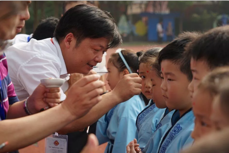 珠江学校每年迎接一年级新生时,都会举办“点朱砂,启智慧”开学礼仪式。击鼓明智、朱砂启智……仪式感满满的古代开学礼,让新入校的一年级新生感受浓厚的校园文化。