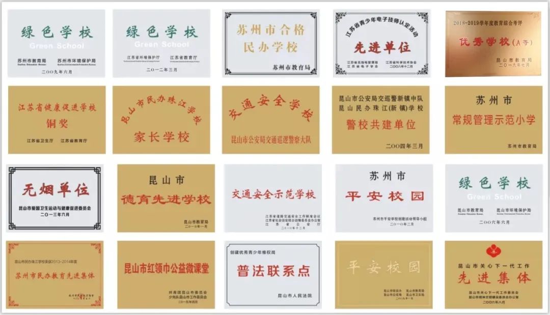 珠江学校实力惊人,先后获得了“江苏省健康促进学校”、“江苏省交通安全示范学校”、“江苏省绿色学校”、“苏州市常规管理示范学校”、“苏州市平安校园”、“苏州市民办教育先进集体”、“昆山市德育先进学校”、“昆山市无烟学校”、“《关心下一代周报》发行工作先进单位”等荣誉称号,学校综合考评在教育局年度考核中,多次获得优秀等第。