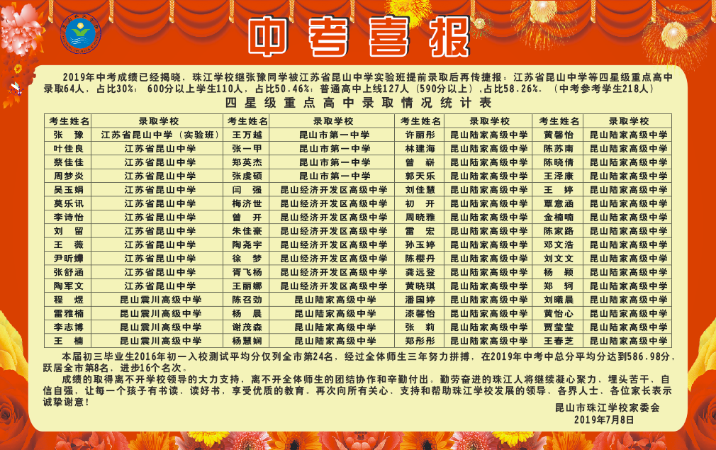 珠江学校2019届被四星级重点高中录取的部分优秀毕业生