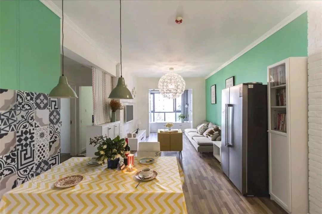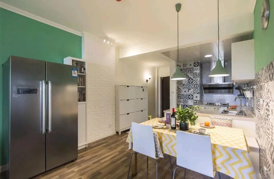 整个玄关、餐厨的设计非常多,花砖上墙,文化砖墙体、收纳和背景墙的主色完美的结合起来,构造出一个清新素雅的小窝。
