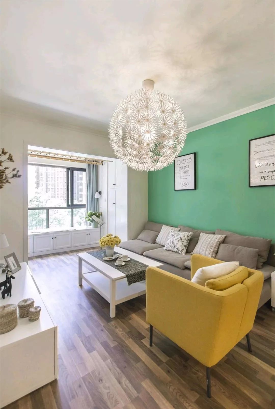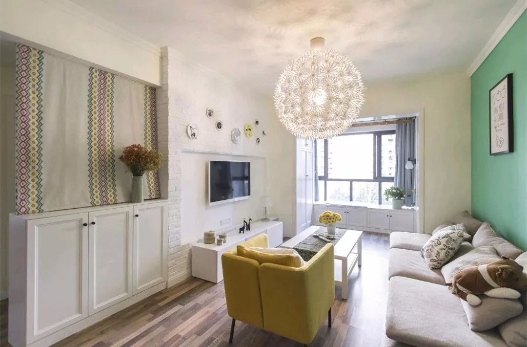 屋主追求舒适的家居氛围,所以设计师给屋主搭配了舒适的布艺沙发,让他们躺着就能看电视,黄色的单人沙发及马克鲁斯吊灯成功抢了人的眼球。