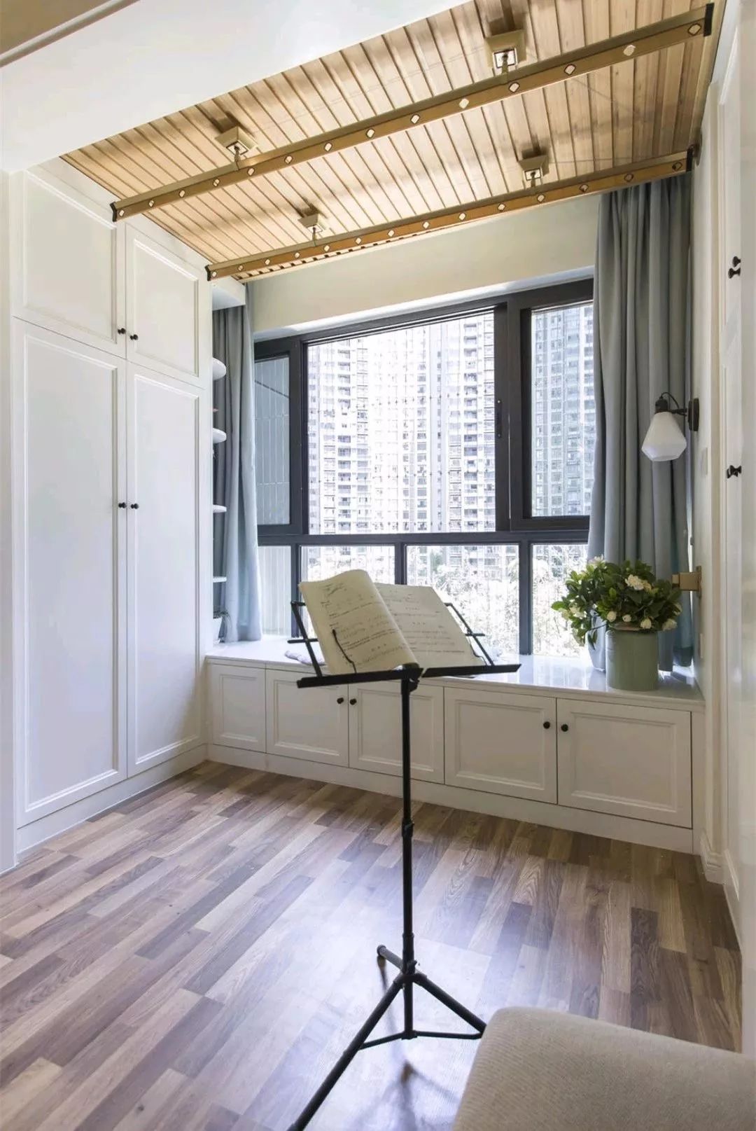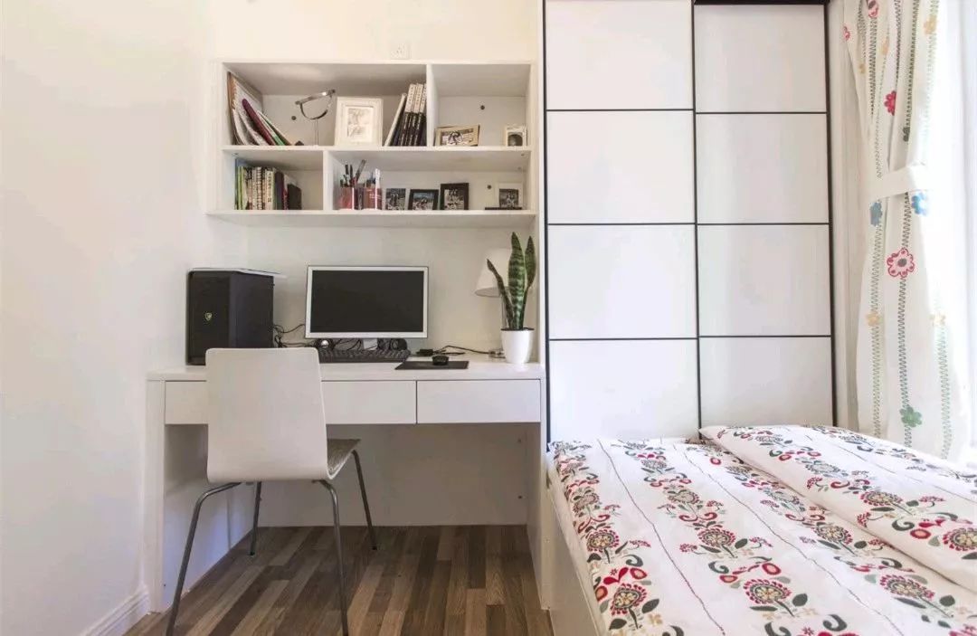 次卧目前作为书房、备用客房来设计,一个榻榻米组合衣柜和书桌柜的设计,不管什么时候都非常的实用。