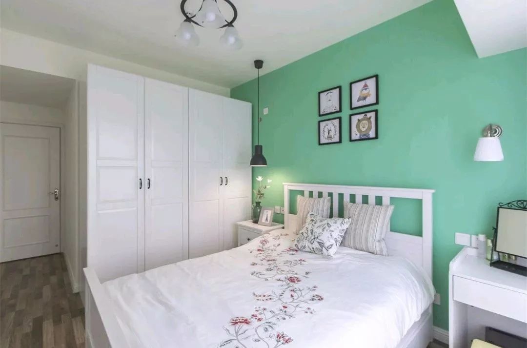 卧室的背景墙延续了客厅的风格,薄荷绿搭配白色来组成这样一个宁静、清新的卧室,让人感觉非常的舒服。