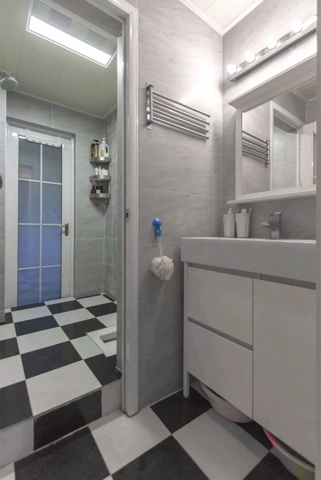 卫生间处是选择了把洗手台放在门口,然后内部做了蹲厕和淋浴,这样的干湿分离也非常适合空间比较小的房子。