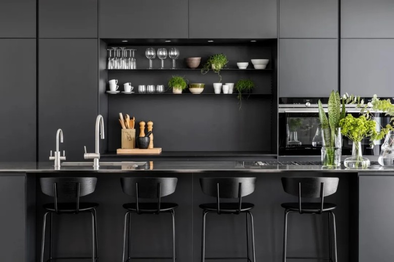 入口左侧是石墨灰色厨房。厨房的设计是两条平行的线,其中有高柜子,这些高柜子整合了整体设备,还有一个带有大型不锈钢台面的岛台。