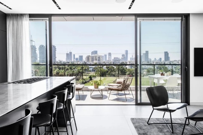 客厅朝向落地窗,悬挂在墙上的电视是空间的焦点。客厅配有明亮的沙发,沙发上带黑色熏漆抽屉,一张桌面是绿松石,另一张桌子是大理石表面。