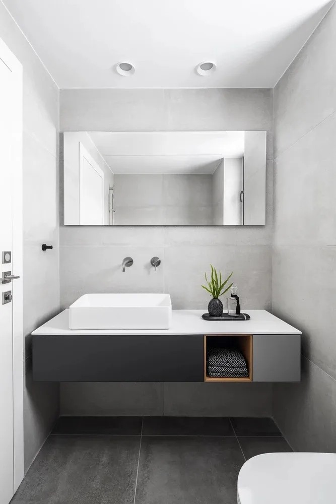 主卧卫生间采用双开门设计,节约开门所占用的空间,洗手台悬空设计,方便打理,也更加整洁。