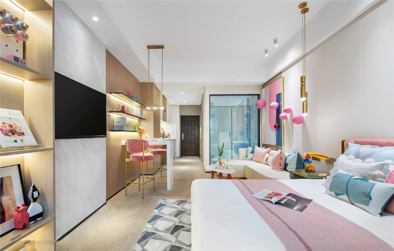 时尚精致曲线造型的家具凸显出女性的特点,生机盎然的绿植花艺,面料、饰品来营造出充满灵感的丰富却不凌乱的空间氛围。这样的空间是浪漫的,是充满激情,充满活力的。