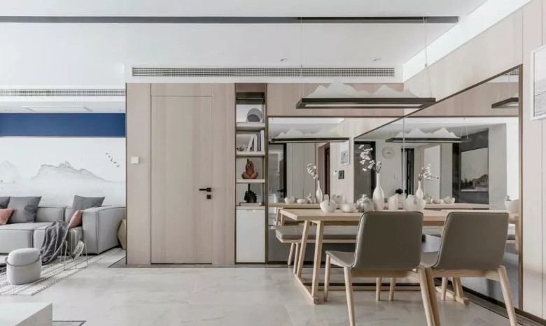 餐厨场域望向客厅视角过厅处的次卧门片,浅木色更加贴合自然,凸显新中气质