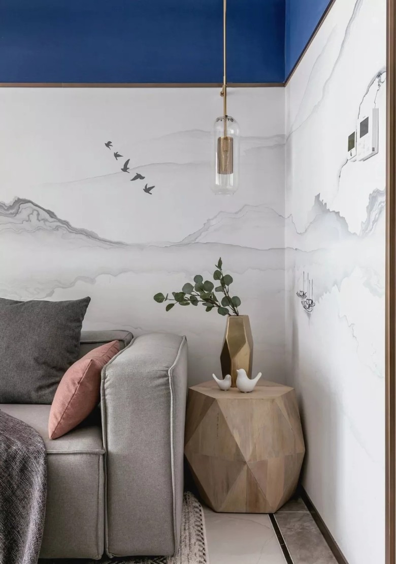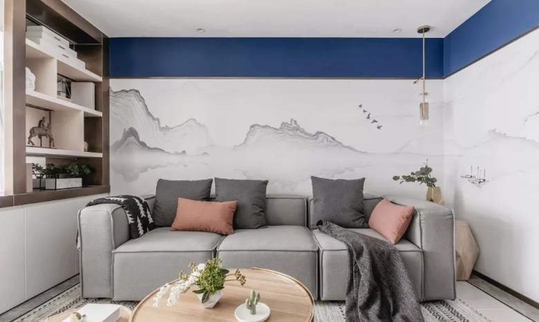 沙发背景墙,定制大幅中国风山水墙布,上方采用不锈钢勾勒出蓝色饰带