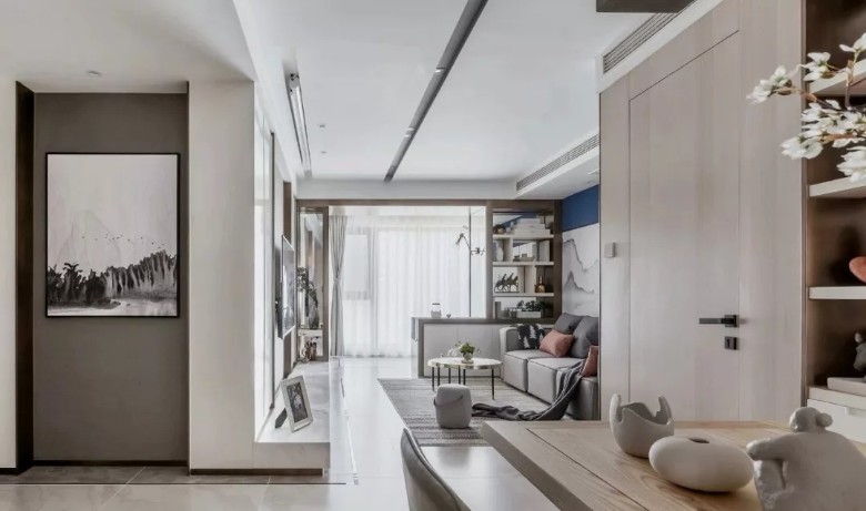 项目面积109平,金领三口之家通过次套空间设计,完美实现当初对居住空间的最初想法,现代感中融入轻中式元素,入户以山水挂画作玄关端景。