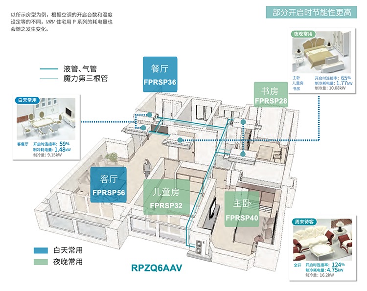 所以,多联机正确的使用方法,应该是先部分开启空调,等达到预期效果,转入低功耗运转模式时,再开启其他空调,快速达到预设温度。