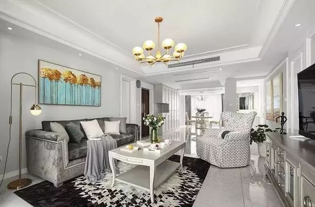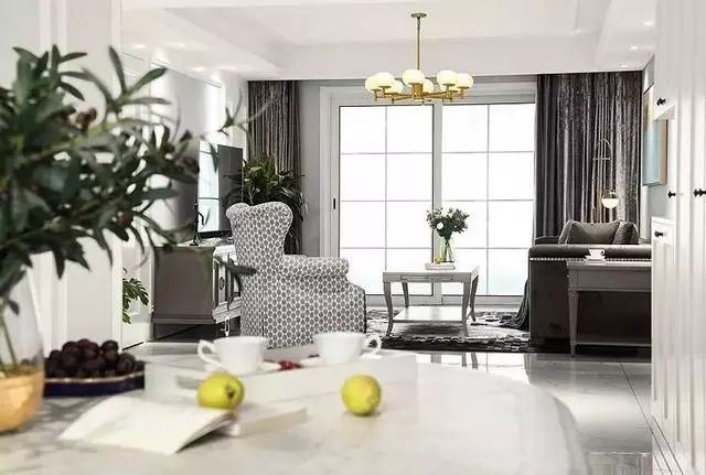 丝绒美式三人沙发与窗帘的材质,有响应的效果,低调内敛,却又流露出一种高贵优雅的气质。金色吊灯与落地灯有锦上添花的效果。