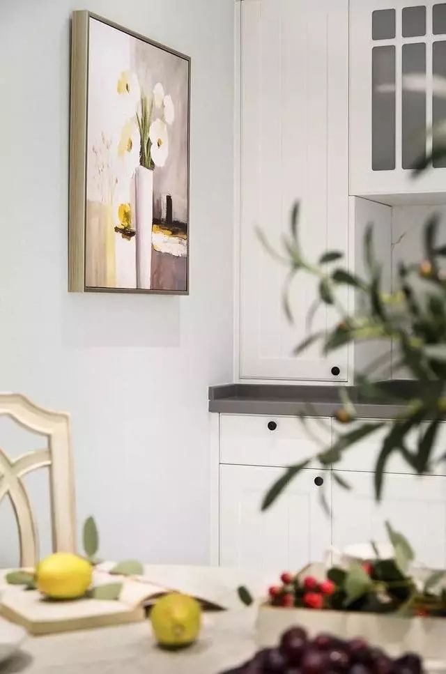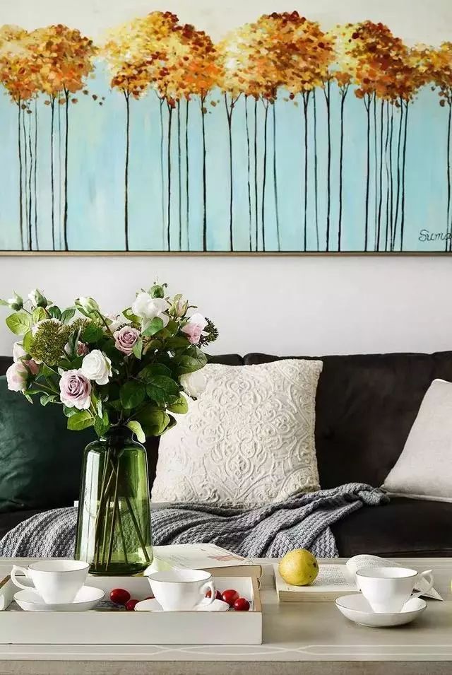 沙发背景装饰画是客厅的点睛之笔,蓝色与金色的美妙碰撞,气质清奇。鲜花的装扮清新唯美。