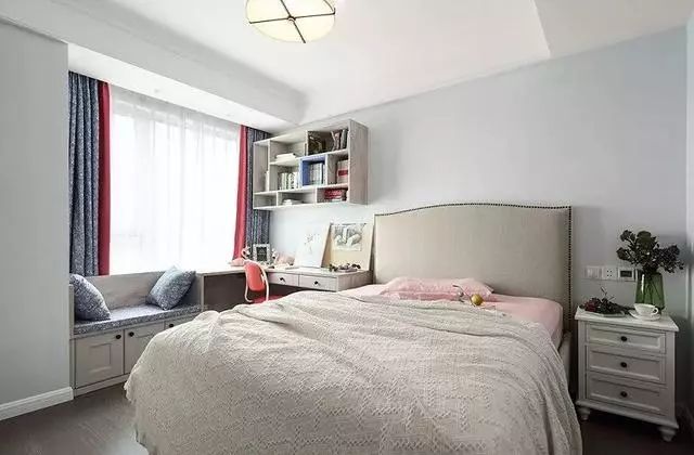 刚上初中的女孩希望自己的卧室是保持原样、毫无杂物的。纯洁的白色和亮丽的浅绿色搭配显得整个卧室没有一丝的污染。卡座和写字台的结合为空间制造更多可能性。