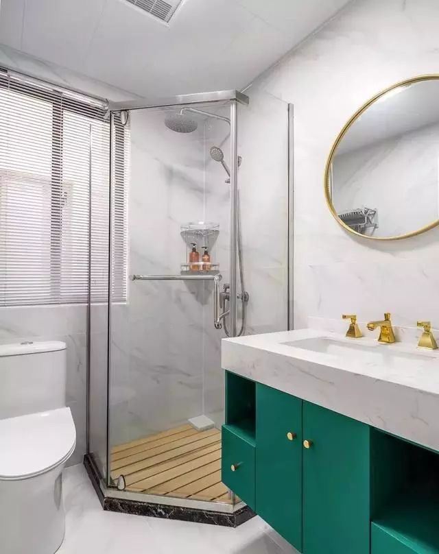 卫生间的布局更加紧凑一些,但是麻雀虽小五脏俱全。钻石形的淋浴房仍然做到了干湿分离。复古色的浴室柜和金属色的镜框、水笼头,让空间陡增精致感。