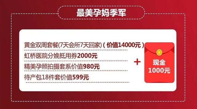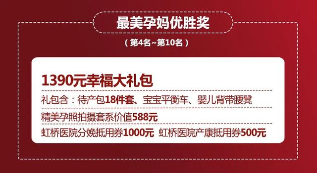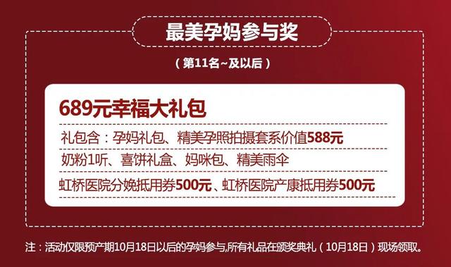 5、领奖需在10月18日下午14:00至虹桥医院进行现场领取,所有获奖孕妈妈上传照片肖像使用权可用于本次主题活动相关宣传内容,请知悉。