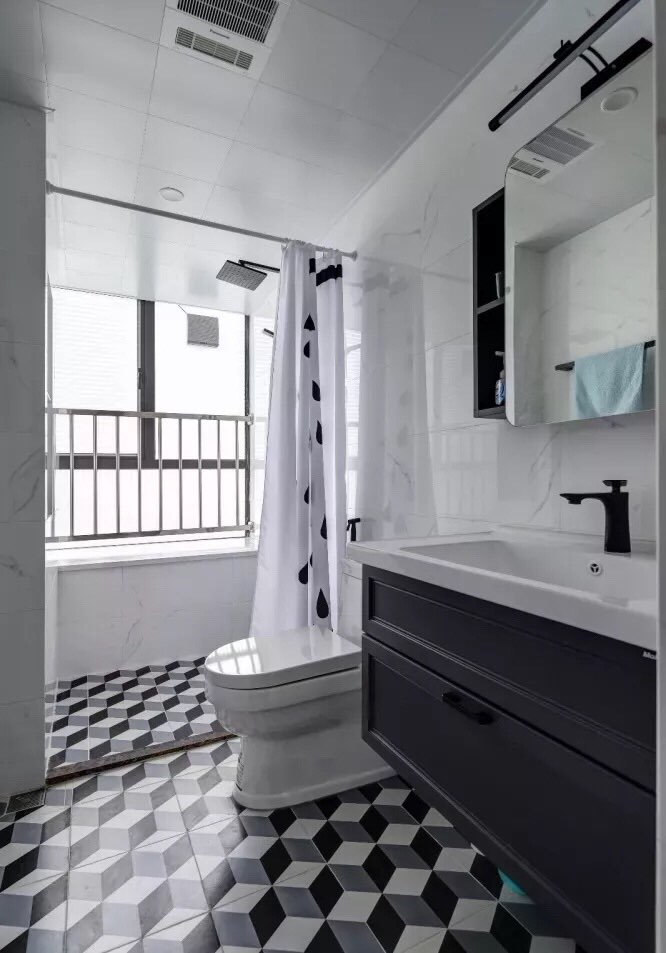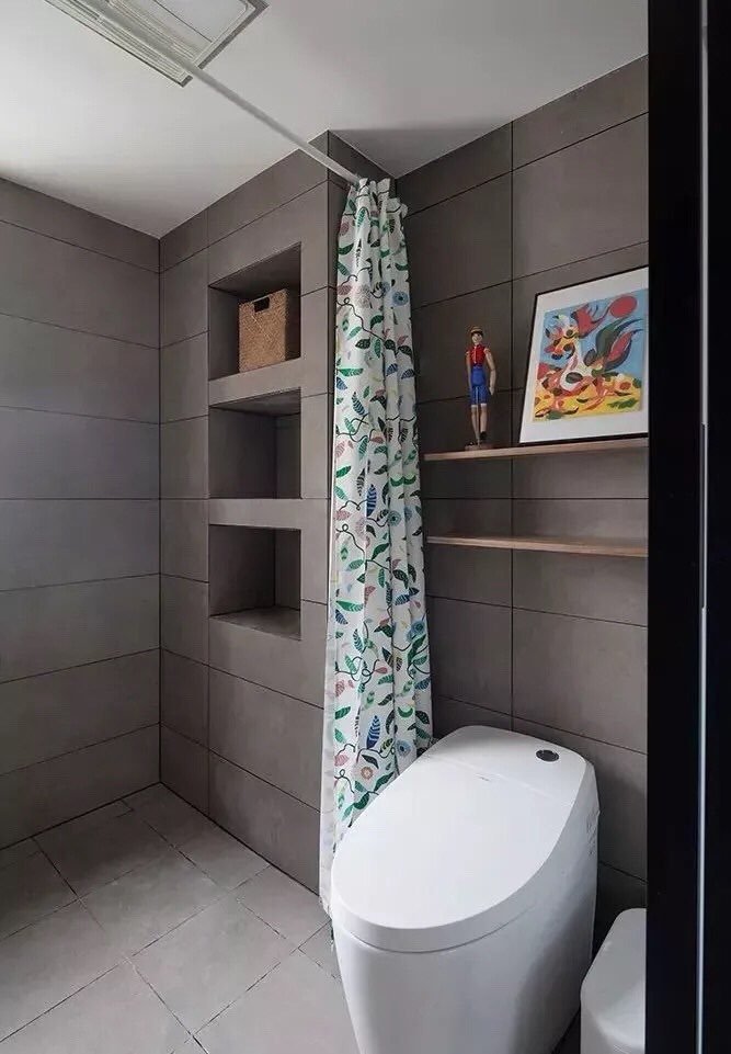卫生间多用纯色设计,带有印花的浴帘和门帘可以起到一定性的装饰作用。