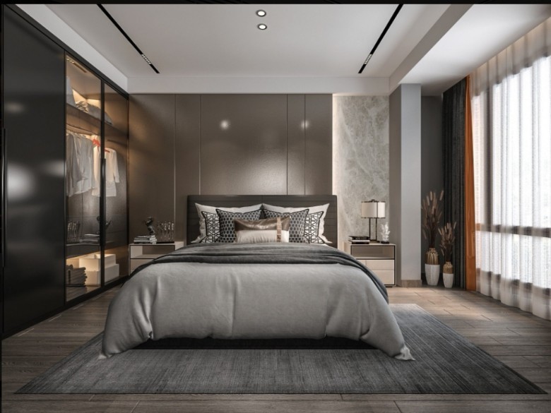 黑灰的色调十分大气简约,床铺下方的地毯与客厅的相照应,,无主灯设计打破常规,搭配橘色拼接窗帘,中和了房间里冷色调。