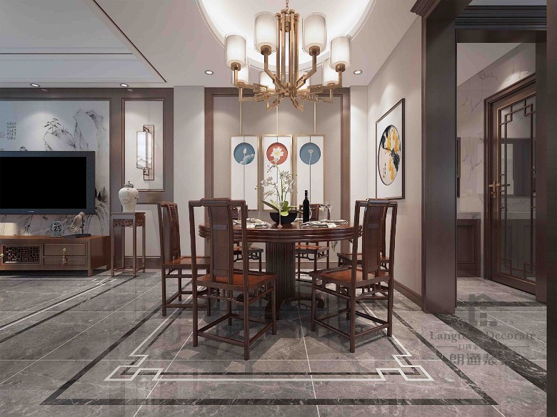 一盏清雅浪漫的古灯,几朵灼灼盛开的鲜花,再加上背景墙的精心勾勒的树枝装饰画、温润细腻的瓷器摆件,设计师在艺术与自然的交织之中,将中式之美隐匿于空间的细枝末节之中,构筑了闲情雅趣的生活氛围。