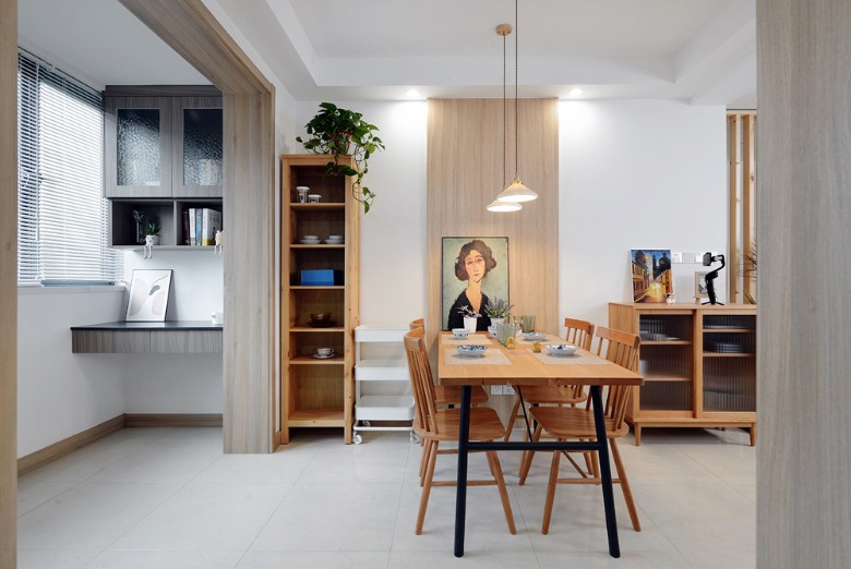 ,搭配原木色家具,辅以白色木饰面点缀,原木色在灰白两色交相呼应下更显清雅淡然。主卧区域的设计采用轻奢风进行装配,与厨餐厅动区空间的风格调性做到了互不干扰且风格多元。