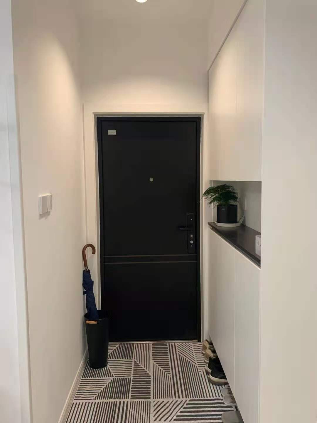 玄关处做了到顶橱柜,中间留空摆上一些绿植或者饰品装饰,让人一回到家就感觉温馨。不规则形花纹地毯,让玄关有了层次感,门口还有一个收纳桶,放置雨伞等,非常实用!
