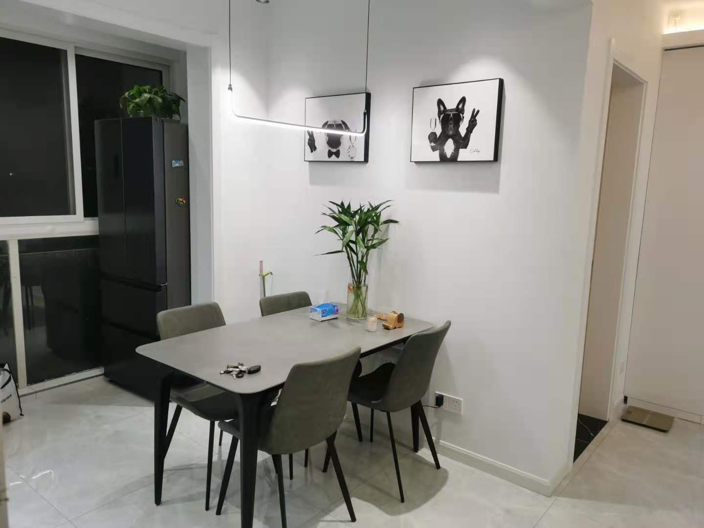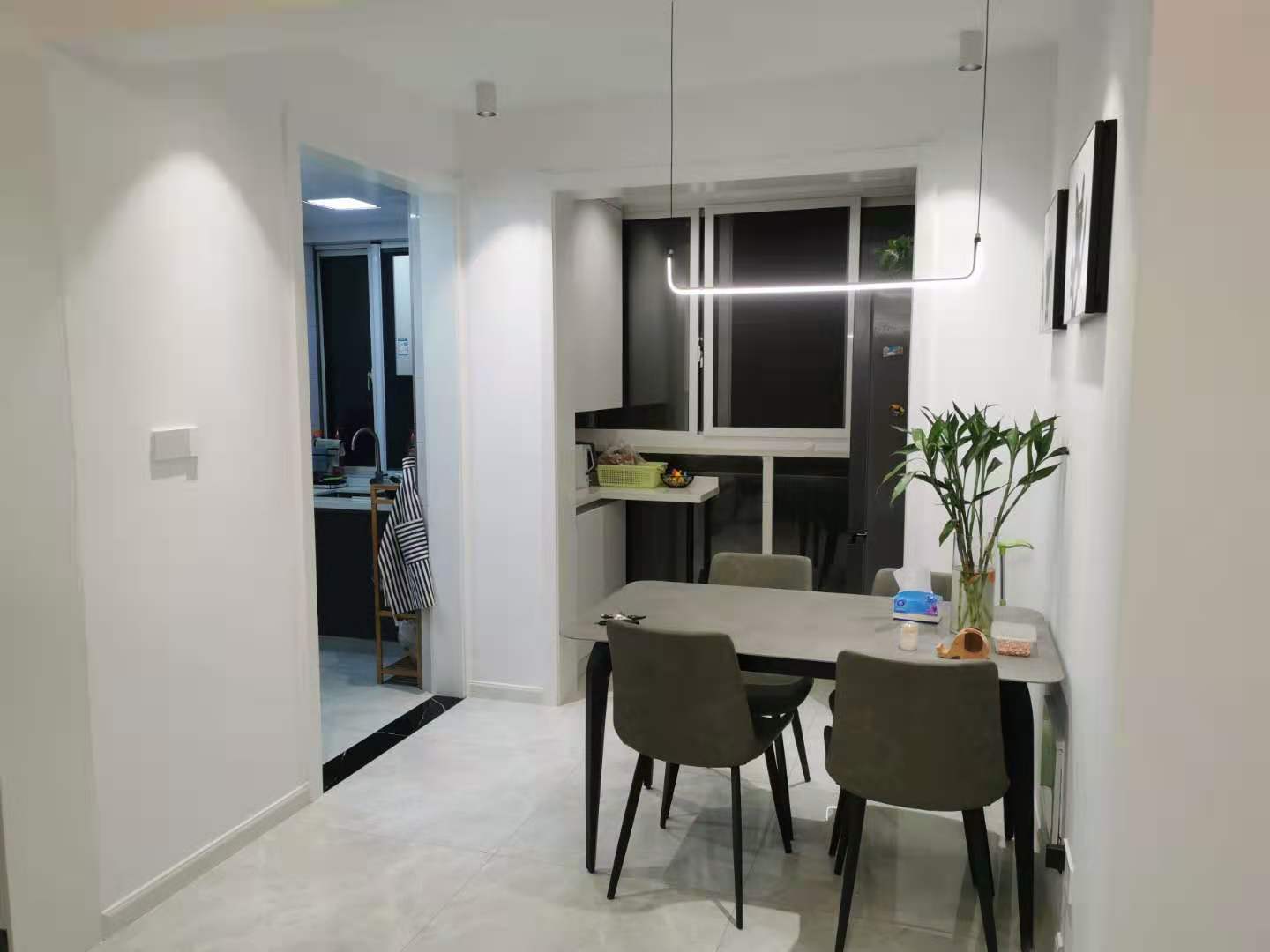 餐厅和客厅一样,也包含了北阳台的一部分,用来放冰箱和储物。 让这个空间得到了延伸。细脚餐桌和细脚凳子看上去轻奢时尚,吊灯也是非常有个性的,墙壁上的画,桌子上的绿植,也为这个餐厅增色不少,在这样的环境下就餐,每一餐都会很愉悦吧!