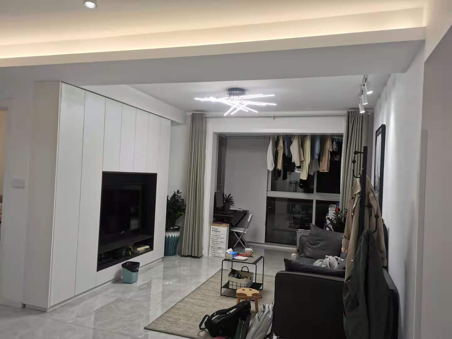 电视背景墙做了内嵌式的橱柜复制收纳。看上去非常清爽。