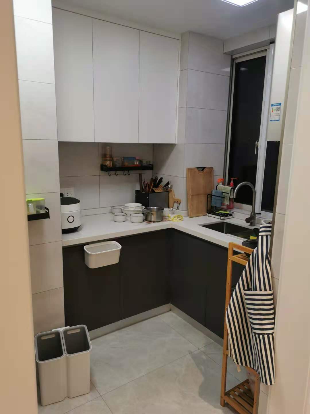 厨房不大,所以在设计的时候主要就是为了方便操作,上面是白色吊柜,下面深咖橱柜,一深一浅,视觉冲击特别强烈,在加上这个白色台面,看上去非常干净整洁。