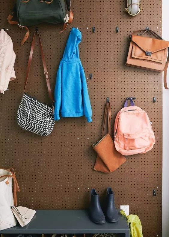 也可以在门厅设计一个专门收纳外出物品的小墙,装上挂钩、洞洞板之类的,不仅外套、包包都有了容身之处,随手的小物都可以有序的放好,拿取的时候也很方便。