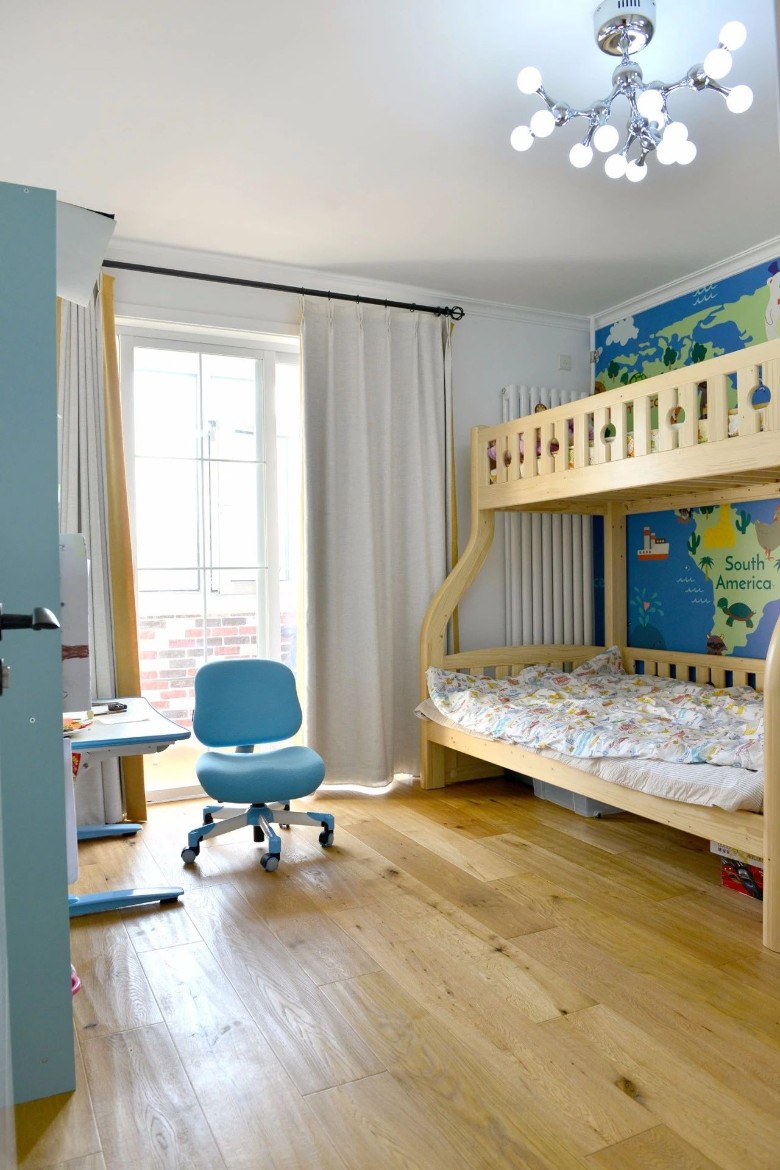 常规的上下床都是叠层式的,如果空间合适的话,根据现场来定做一个交错式的上下床,这样上床下方可以留出一个书台位置,空间的利用也更加有趣。