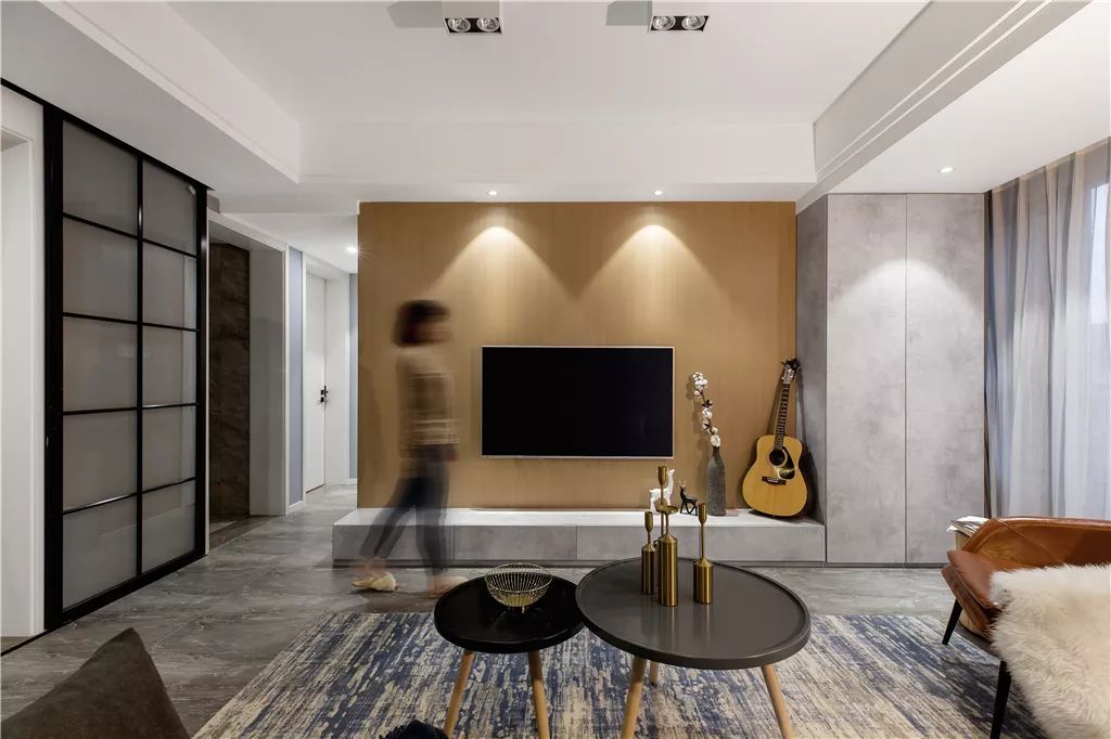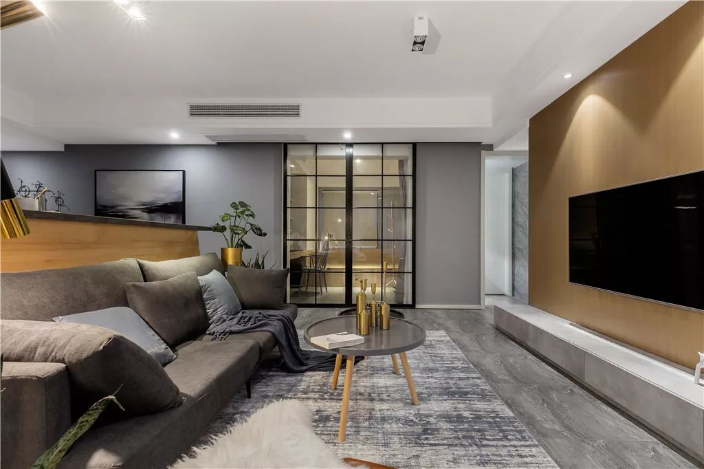 客厅整体以简约舒适的空间,灰色的地面砖、地毯与沙发布置,结合电视墙的木饰面,布置出一种自然轻松的氛围感。