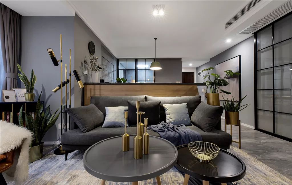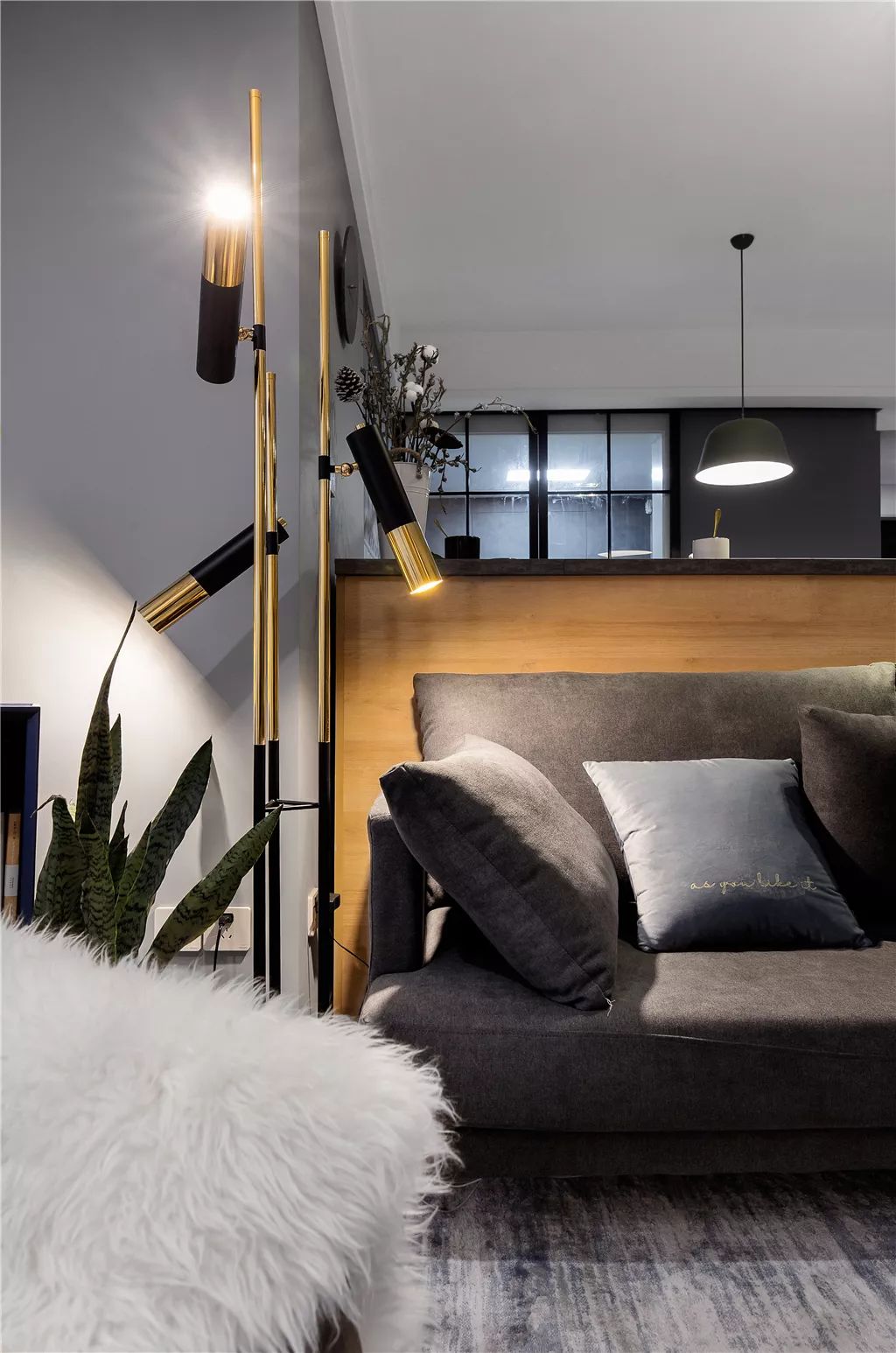 沙发墙是个矮墙吧台,布置灰色布艺沙发,旁边是落地灯与花盆绿植,带来的是一种简约自然的舒适与华丽感。