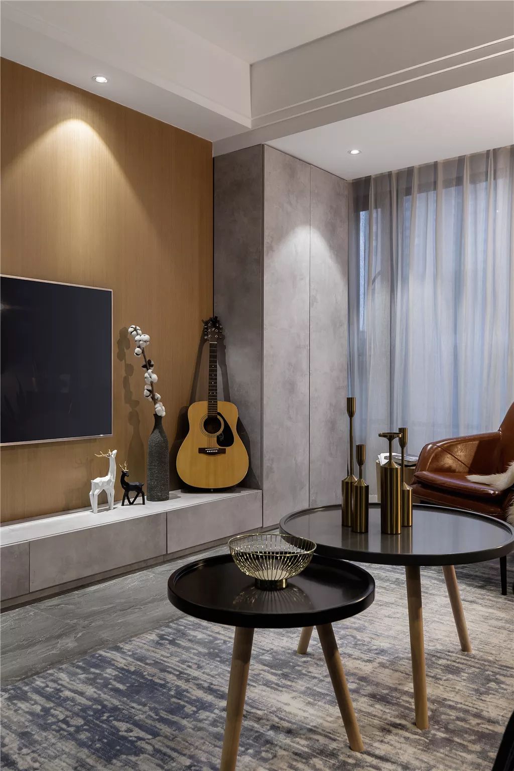 电视墙以木饰面+水泥灰色的定制电视柜与侧边收纳柜,简洁自然的设计,让空间充满轻松舒适的气质感。